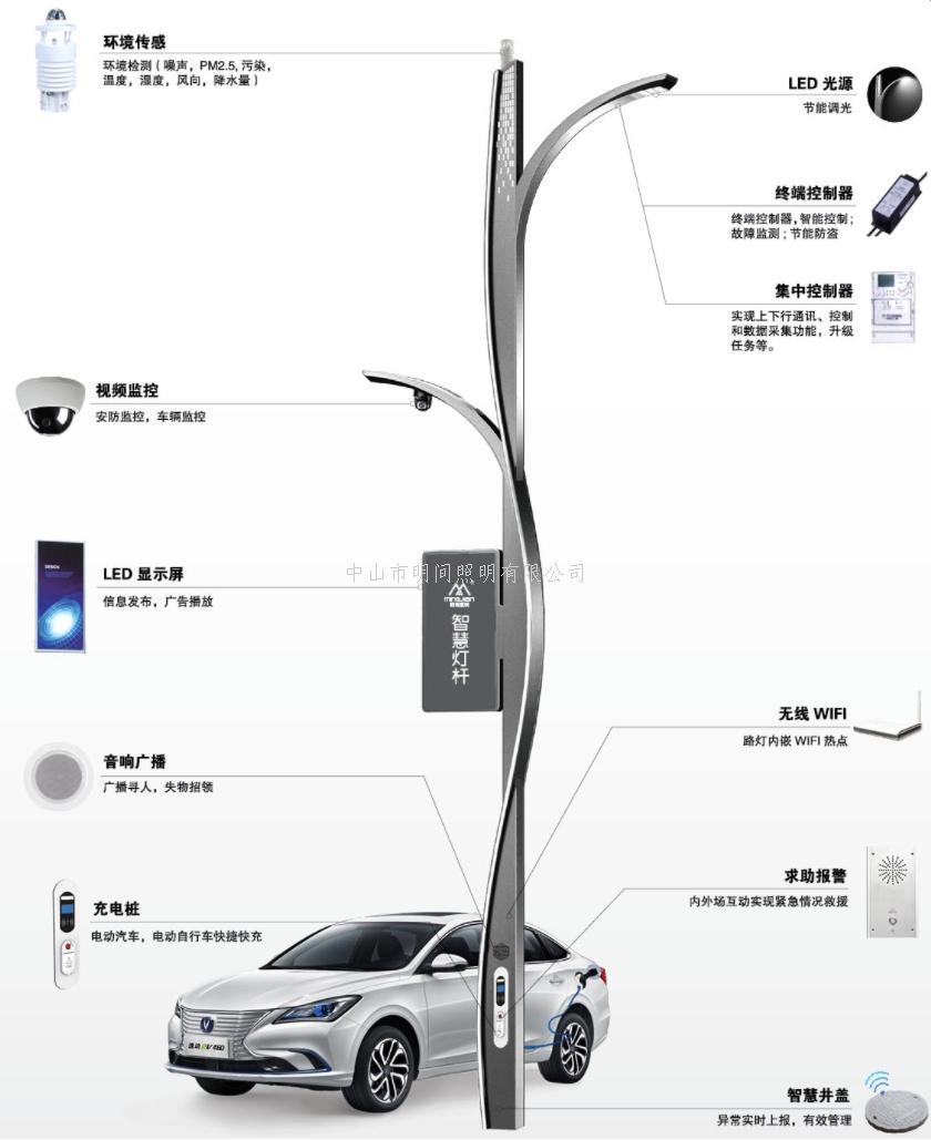 智慧杆是集智慧照明、视频监控、交通管理、环境检测、无线通信、信息交互、应急求助等多功能于一体的公共基础设施,可挂载 4G/5G 通信基站、WiFi 无线网络、智能节能路灯、智能安防监控、智能人脸识别、交通诱导与指示、汽车充电桩、停车无感支付、无人驾驶诱导等设备。